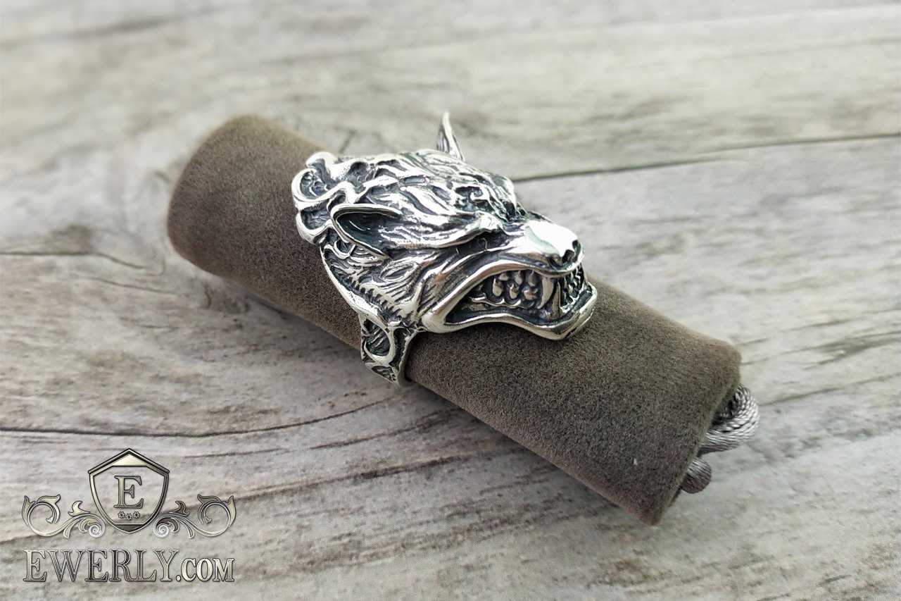 На фото изображено мужское серебряное кольцо с головой волка (оскал).